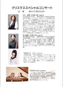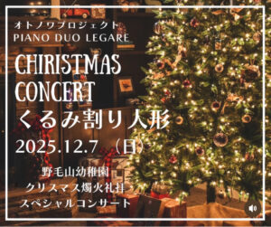 2025年12月7日㈰昨年に引き続き、野毛山幼稚園、年長組の皆さん、ご家族の皆さまに向けての燭火礼拝、スペシャルコンサートにLegareピアノデュオとして香川真澄、井上絵美が出演させて頂きます。